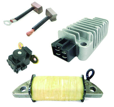 Manejamos líneas de bobinas de luces, carga, encendido, reguladores de corriente, regulador – rectificador, CDI (sistemas de encendido electrónico), flasher electrónico, bobinas pulsoras. Estas piezas se fabrican con alambre de cobre con recubrimiento de poliestirimida y poliamidoamina lo que aumenta la estabilidad térmica permitiendo temperaturas hasta de 200º c.
